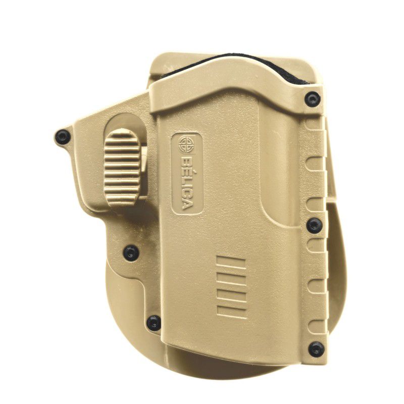 Possui catraca rotativa que possibilita a rotação do coldre, facilitando o manuseio do equipamento.